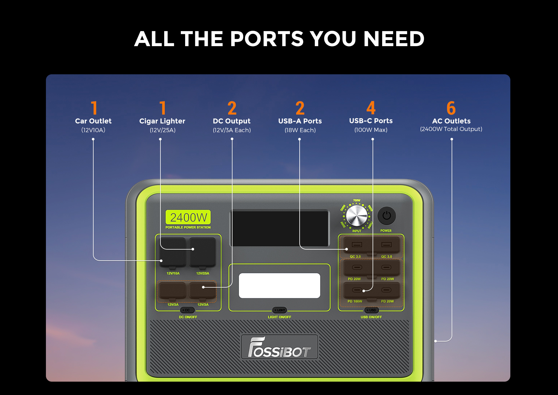Потужна зарядна станція з неабияким потенціалом у плані резервного живлення найрізноманітнішої техніки. Силянок у моделі цілком достатньо, щоб потягнути автономну роботу холодильника, мікрохвильової печі, циркуляційного насоса системи теплопостачання, телевізора, стаціонарного комп'ютера і т.п. Водночас пристрій допоможе зарядити мобільні гаджети та ноутбуки. До всіх портів Fossibot F2400 допускається підключати навантаження потужністю до 2400 Вт, а в моменти запуску силових агрегатів електрообладнання зарядна станція витримує пікові стрибки потужності до 4800 Вт.