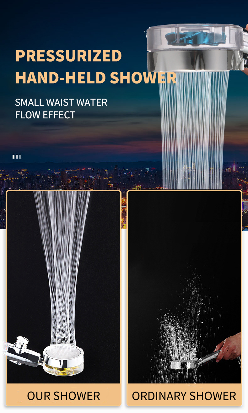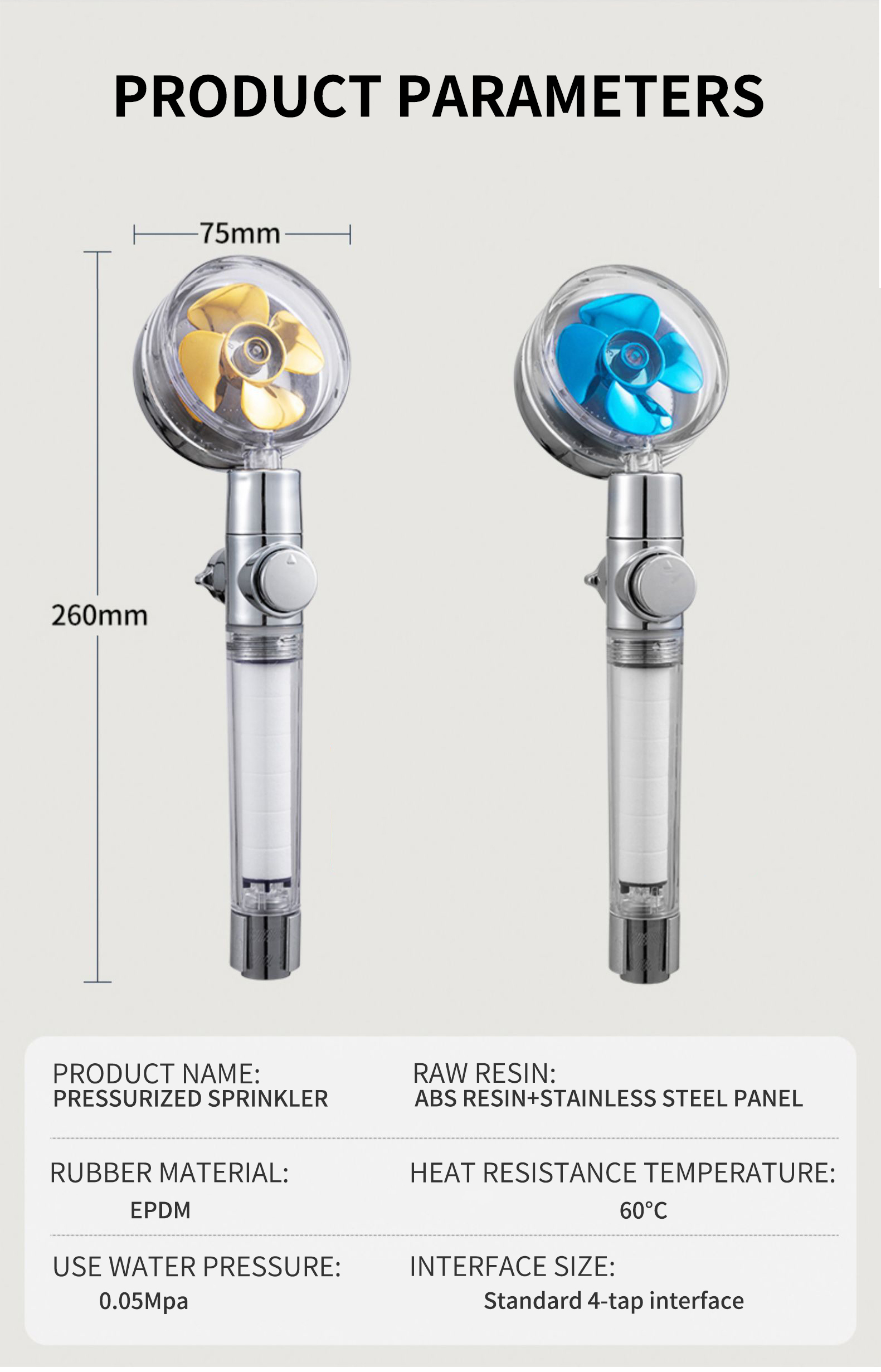 Насадка для душу із турбо вентилятором - створює потік води під тиском через вентилятор, що обертається, збільшуючи швидкість потоку води, тим самим збільшуючи тиск води і підвищуючи економічність.