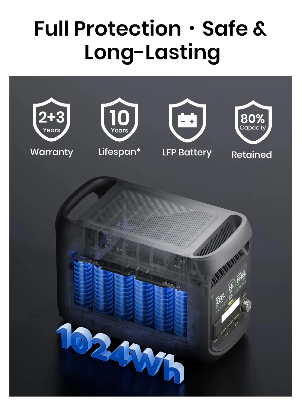 Станція оснащена сучасним акумулятором LiFePO4 ємністю 1024 Wh, що гарантує високу безпеку, довгий ресурс роботи та стабільну подачу енергії навіть при інтенсивному використанні.